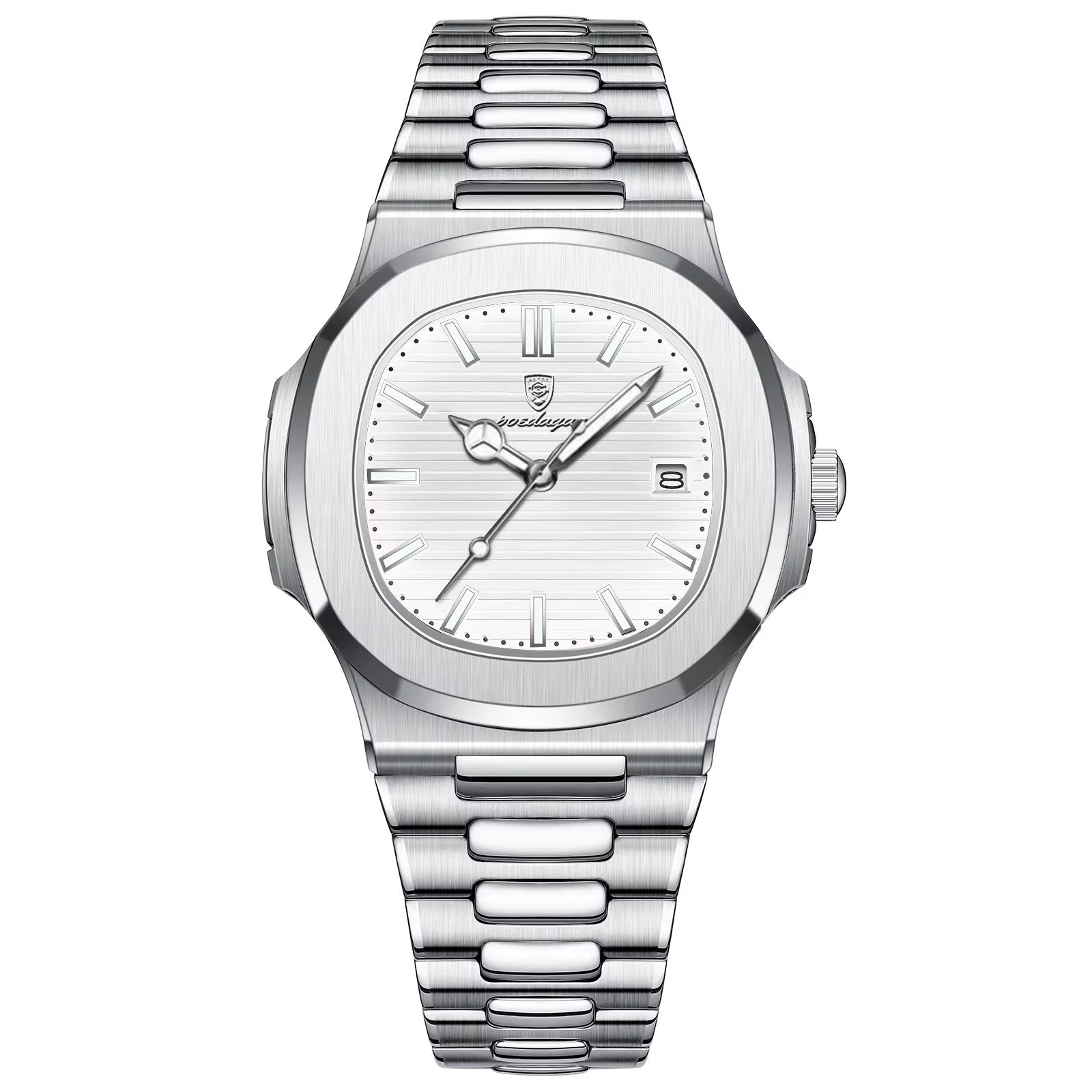 Un reloj que irradia sobriedad y claridad. Este diseño se distingue por su acabado integral en acero inoxidable, que acentúa la luminosidad de su esfera blanca/plateada y texturizada. Es la opción más purista de la colección, ideal para quien busca un lujo sutil y la máxima versatilidad.